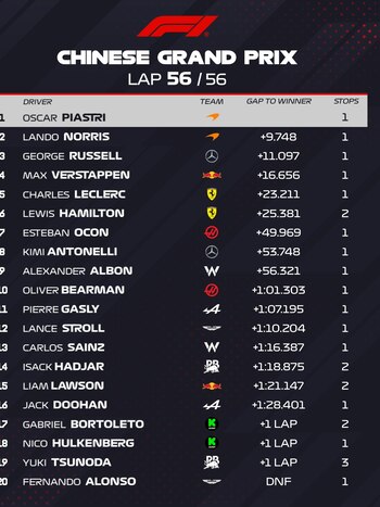 Tras un fin de semana cargado de acción en el Circuito Internacional de Shanghái, Oscar Piastri se impuso luego de largar desde la pole position. Lando Norris completó el 1-2 de McLaren en el Gran Premio de China y se mantiene en la punta del campeonato. El podio lo completó George Russell, con Mercedes.