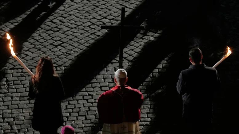 El vía crucis conmemora las últimas horas de la vida de Jesús, desde su condena a muerte y el momento en que toma la cruz hasta su crucifixión, muerte y sepultura. La procesión termina fuera del Coliseo, en lo alto del monte Palatino.