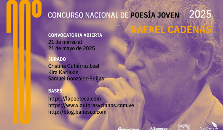 Banesco Banco Universal -cuya política de Responsabilidad Social Empresarial tiene como pilares el fomento a la educación, la salud y la inclusión financiera de los venezolanos- Autores Venezolanos, Fundación La Poeteca y Team Poetero convocan a los jóvenes creadores a participar en el 10° Concurso Nacional de Poesía Joven Rafael Cadenas 2025. Las postulaciones están abiertas hasta el 21 de mayo de 2025 a las 11:59 p.m., hora de Caracas.