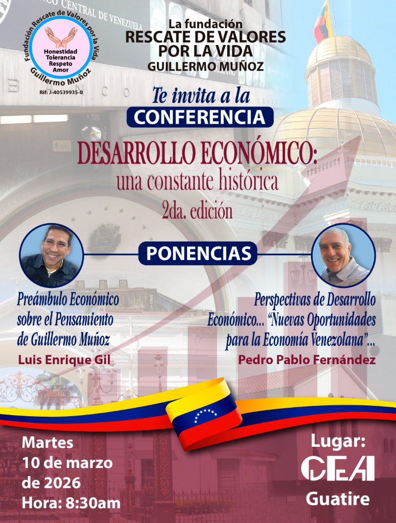 La Fundación Rescate de Valores por la Vida Guillermo Muñoz, tiene programada la segunda edición de la Conferencia «Desarrollo Económico: una constante histórica», que se llevará a cabo en la ciudad de Guatire, el próximo martes 10 de marzo de 2026 en el Auditorio del Centro de Educación Artística CEA «Andrés Eloy Blanco».