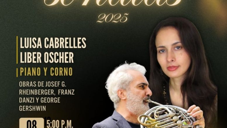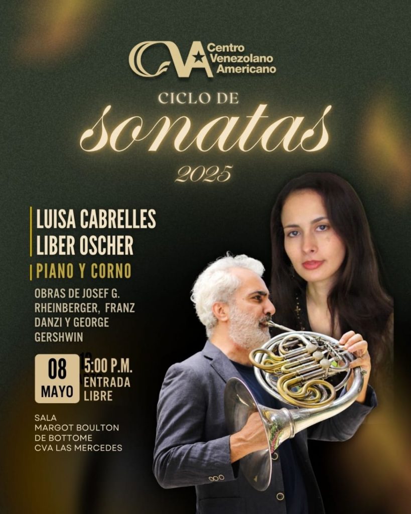 El jueves 8 de mayo de 2025 a las 5:00 p.m., la pianista Luisa Cabrelles y el cornista Liber Oscher ofrecerán un recital en la Sala Margot Boulton de Bottome del CVA Las Mercedes, como parte de la programación del Ciclo de Sonatas que lleva a cabo el Centro Venezolano Americano a lo largo del año.