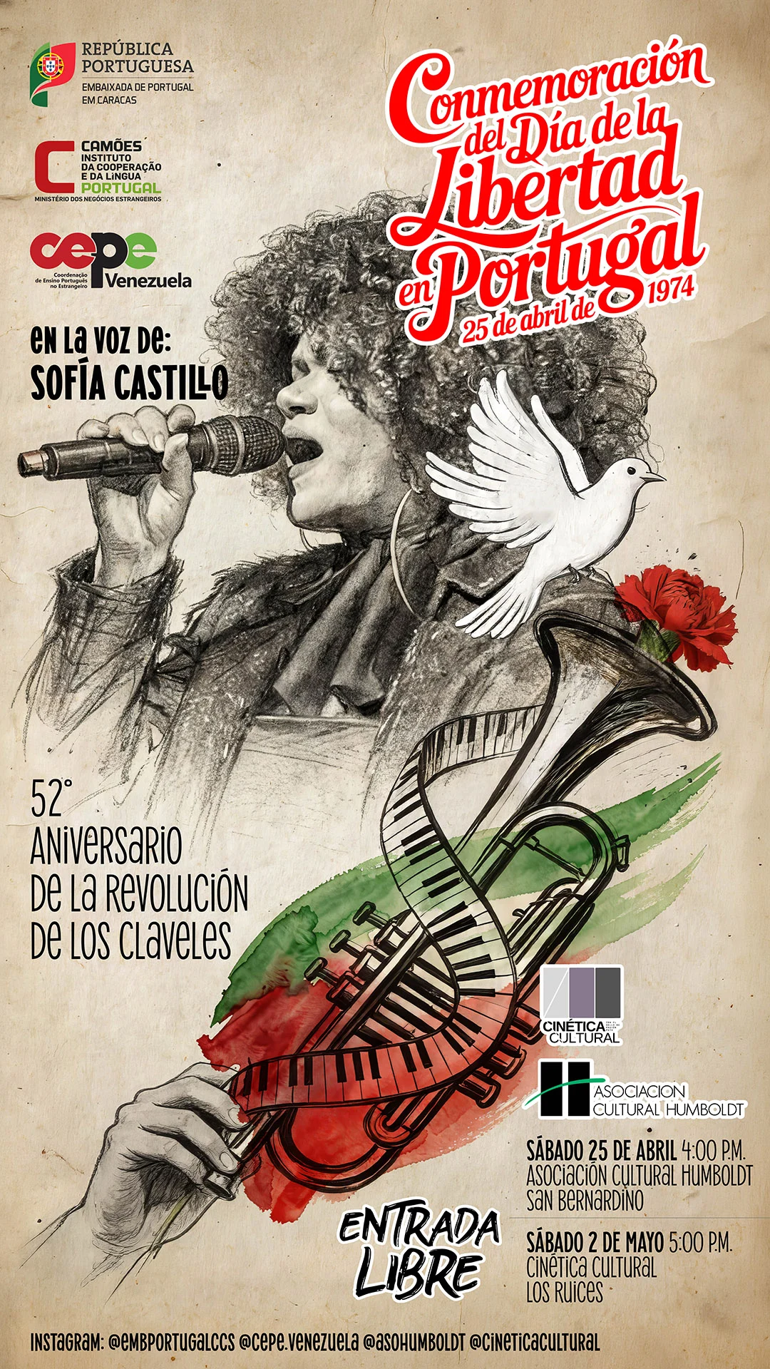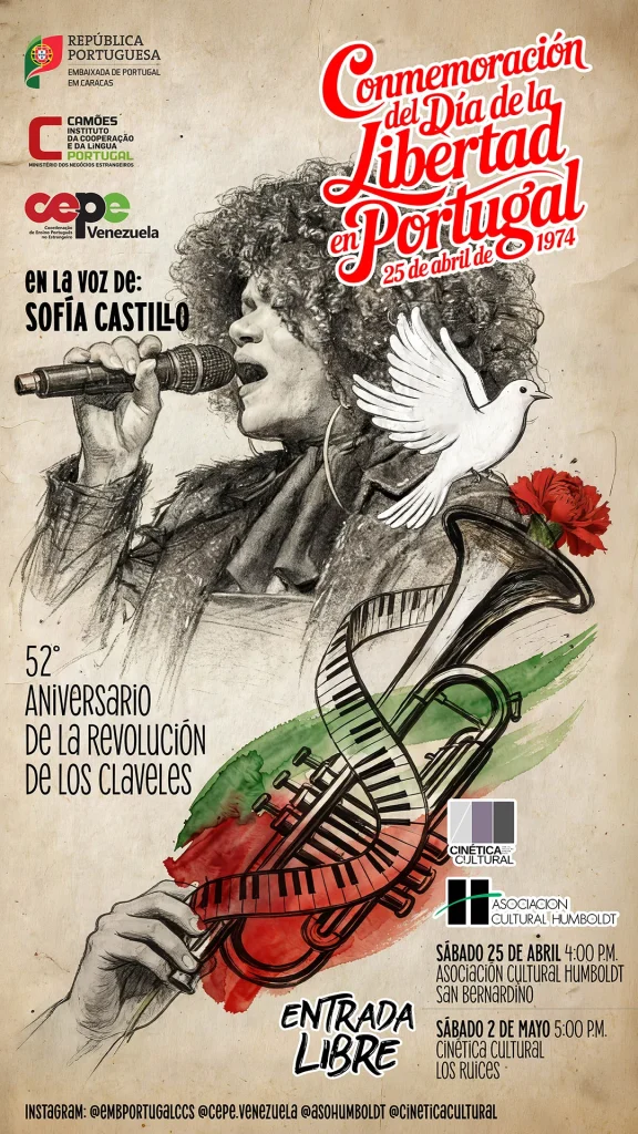 Caracas, Venezuela. — La Embajada de Portugal en Caracas conmemora el 52.º aniversario de la Revolución de los Claveles con una programación que enlaza historia, comunidad y creación compartida. La iniciativa se realiza en alianza con el Camões – Instituto da Cooperação e da Língua I.P., CEPE Venezuela, la Asociación Cultural Humboldt y Cinética Cultural.