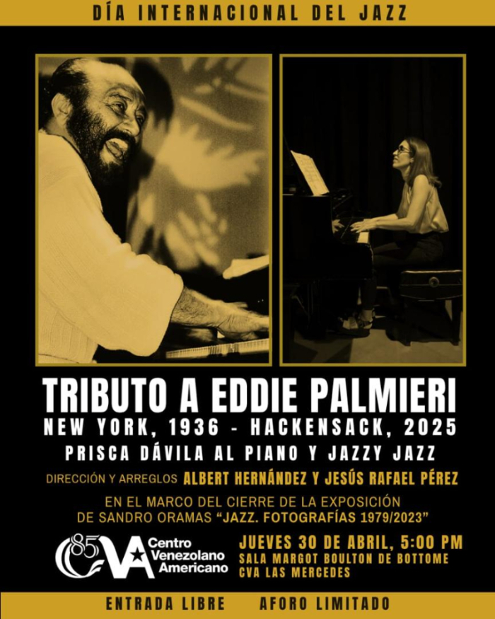 El jueves 30 de abril de 2026 a las 5:00 p.m., se realizará un tibuto a Eddie Palmieri en la Sala Margot Boulton de Bottome del CVA Las Mercedes para celebrar el Día Internacional del Jazz, con un concierto a cargo de la pianista, cantante y compositora venezolana Prisca Dávila y el grupo Jazzy Jazz, en el marco del cierre de la exposición “Jazz. Fotografías 1979/2023” del fotógrafo Sandro Oramas, que se presenta actualmente en ese espacio, como parte de la programación cultural que desarrolla el Centro Venezolano Americano para celebrar su 85 aniversario.