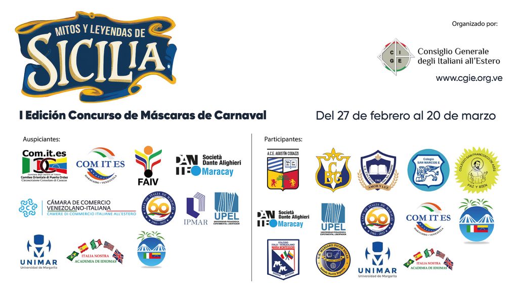 El Consejo General de los Italianos en el Exterior (CGIE) en Venezuela anunció el lanzamiento de la primera edición del Concurso de Máscaras de Carnaval “Mitos y Leyendas de Sicilia”, con el objetivo de incentivar entre los jóvenes la creatividad, el trabajo artesanal y el redescubrimiento de las figuras legendarias que han marcado la cultura de la isla: desde los dioses y las ninfas hasta los gigantes y los espíritus que habitan su memoria colectiva.