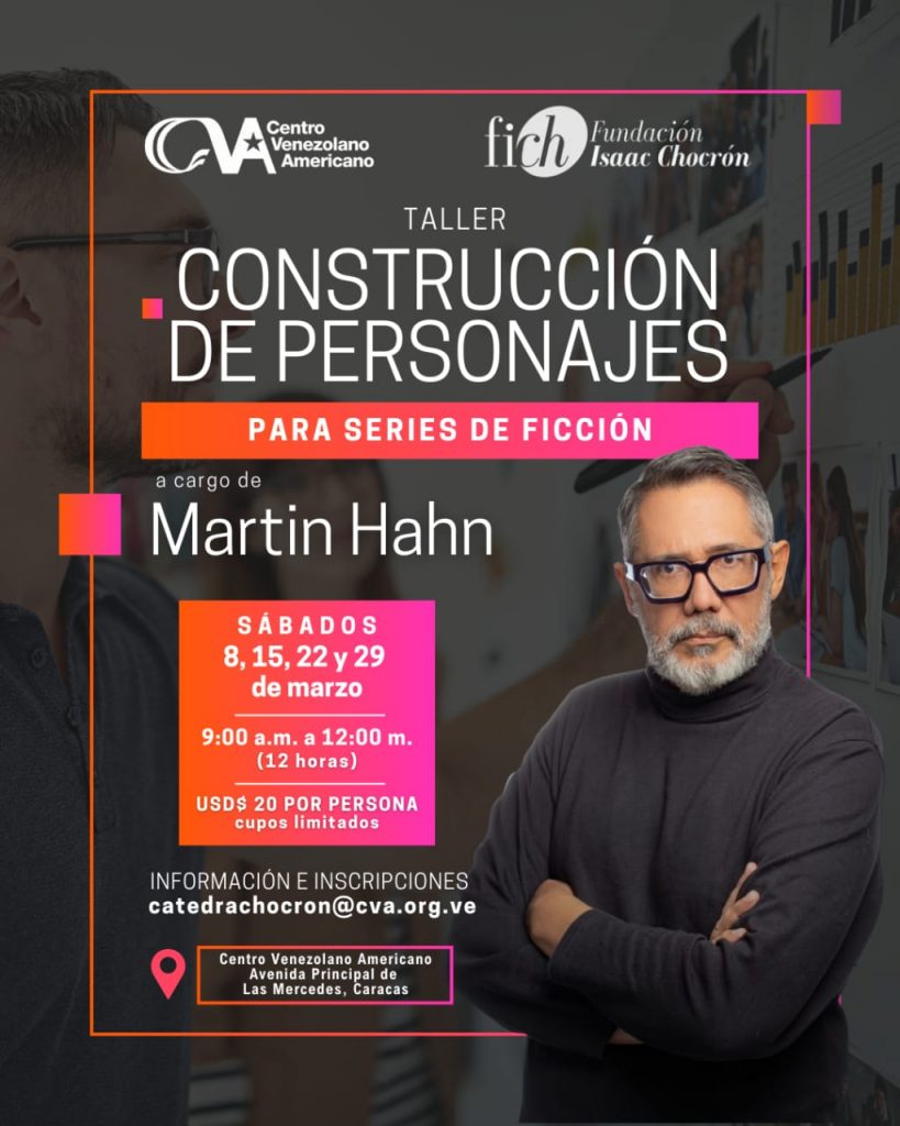 Se inició el proceso de inscripciones para el  taller Construcción de Personajes para Series de Ficción, que será dictado en la Sala Margot Boulton de Bottome del CVA Las Mercedes por el escritor y guionista venezolano Martin Hahn, los días sábados 8, 15, 22 y 29  de marzo de 2025, de 9:00 a.m. a 12:00 m., en el marco de la alianza entre la Fundación Isaac Chocrón y el Centro Venezolano Americano, y con el objetivo de ofrecer actividades formativas que contribuyan al desarrollo de la dramaturgia audiovisual en Venezuela.