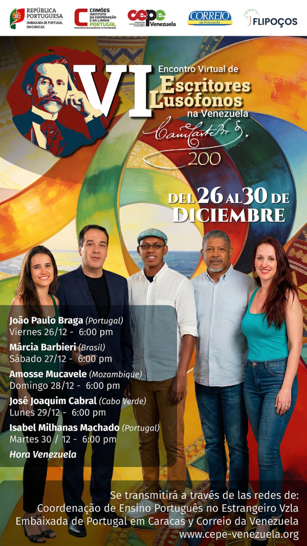 La Coordinación para la Enseñanza del Portugués en Venezuela (CEPE Vzla), en colaboración con la Embajada de Portugal en Caracas, Camões, I.P., el Festival Literario Internacional Flipoços y el Correio de Venezuela, anuncia que el VI Encuentro Virtual de Escritores Lusófonos se celebrará entre el 26 y el 30 de diciembre. Este Encuentro reafirma el compromiso cultural y educativo de Portugal con Venezuela.