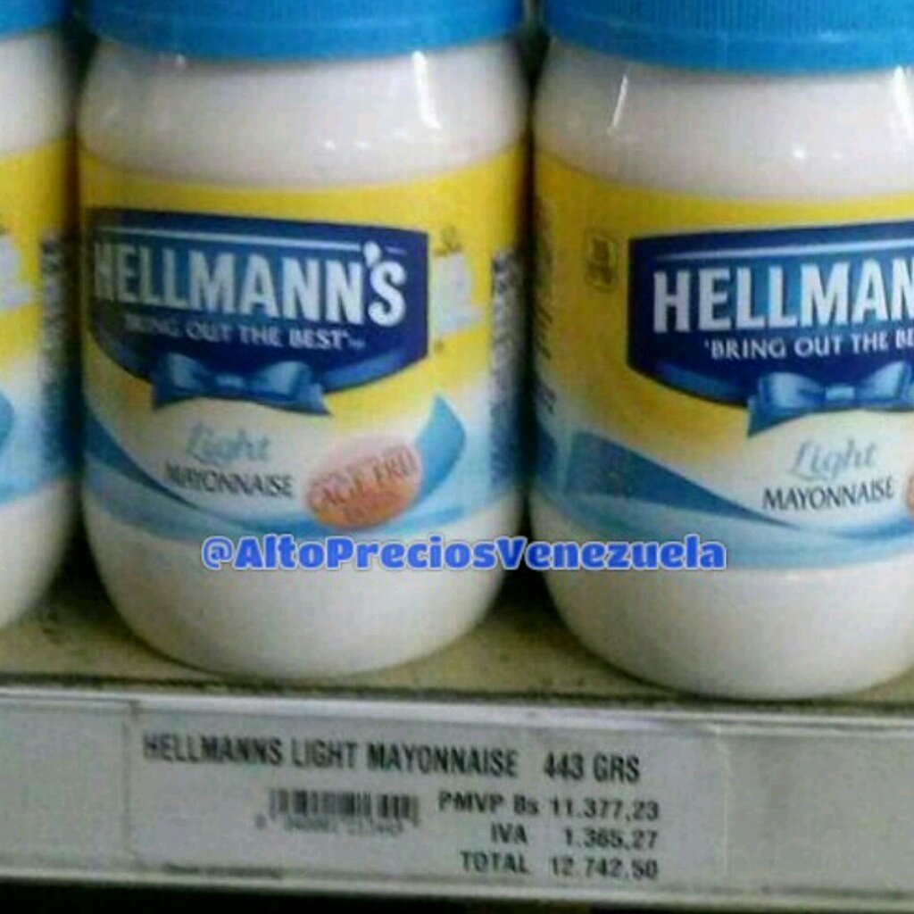 Mayonesa Hellmanns 443 grs!! 12.743 Bs ………!!! #altopreciosvenezuela #preciosjustos #PreciosQueSorprenden pic.twitter.com/rNLO7w1wAM