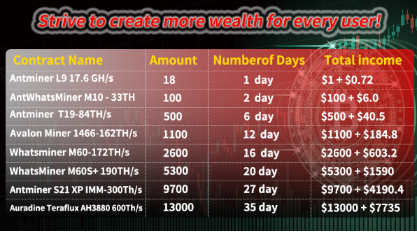 Seguridad de Fondos: La plataforma ofrece varios contratos de minería, todos con garantía del 100% del capital e intereses. Los intereses se calculan diariamente después de la compra y las ganancias se liquidan al instante. Las ganancias diarias se pueden retirar inmediatamente y están disponibles 24/7.