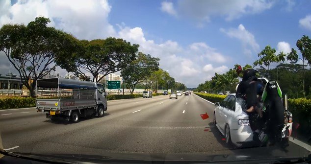 Una moto con dos ocupantes circulaba a gran velocidad por una autopista de Singapur. El motorizado no vio que un carro estaba parado en el mismo carril por el que circulaba y se estrelló bruscamente contra la parte trasera del auto.