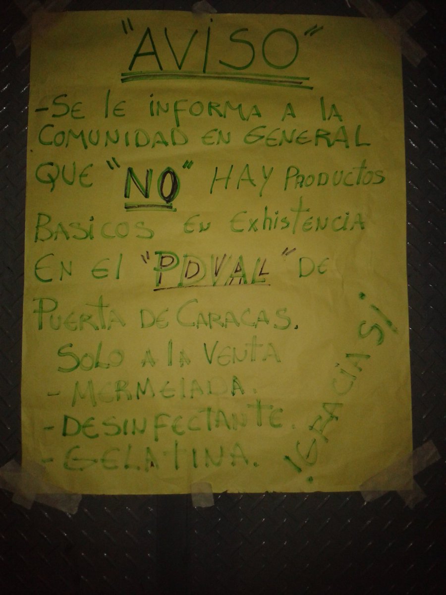 Un letrero publicado en las redes sociales señala que supuestamente“no hay productos básicos en existencia” en un Pdval ubicado en Puerta Caracas, en la ciudad capital.