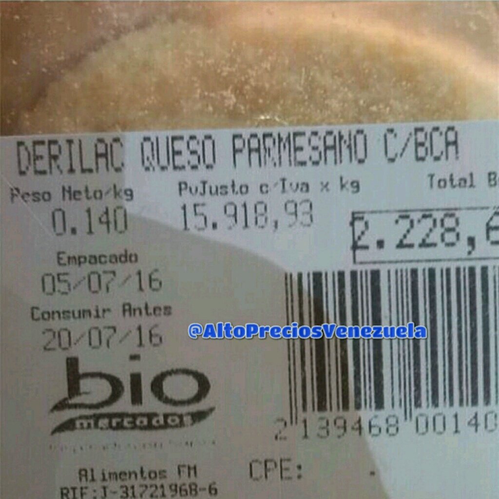 Según la imagen publicada por un usuario en la red social Twitter, el kilo de queso parmesano se encuentra en 15.919 bolívares.