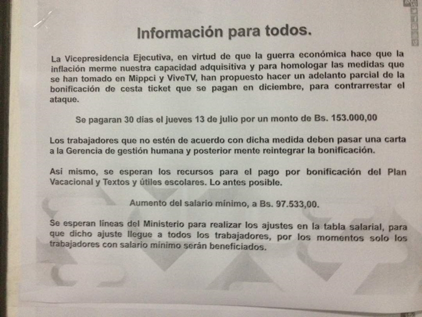 A través de un anuncio publicado en la sede, se informó que el día jueves recibirán un monto de 153.000 bolívares, recursos absolutamente insuficiente ante una Canasta Básica Familiar que supera 1 millón de bolívares. Asimismo, se advierte que quien no esté de acuerdo deberá enviar una carta a la gerencia de recursos humanos para hacer el reintegro de la bonificación.