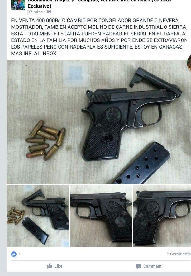 El periodista de sucesos, Román Camacho, publicó en su cuenta Twitter una publicación de un grupo de trueques de Facebook. El usuario intenta cambiar nada más y nada menos que una pistola Prieto Beretta 6.35 MM y 8 balas por un congelador, nevera mostrador, molino de carne industrial o una sierra.