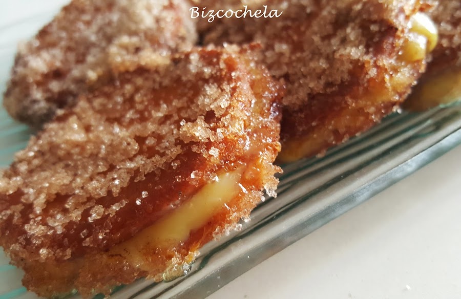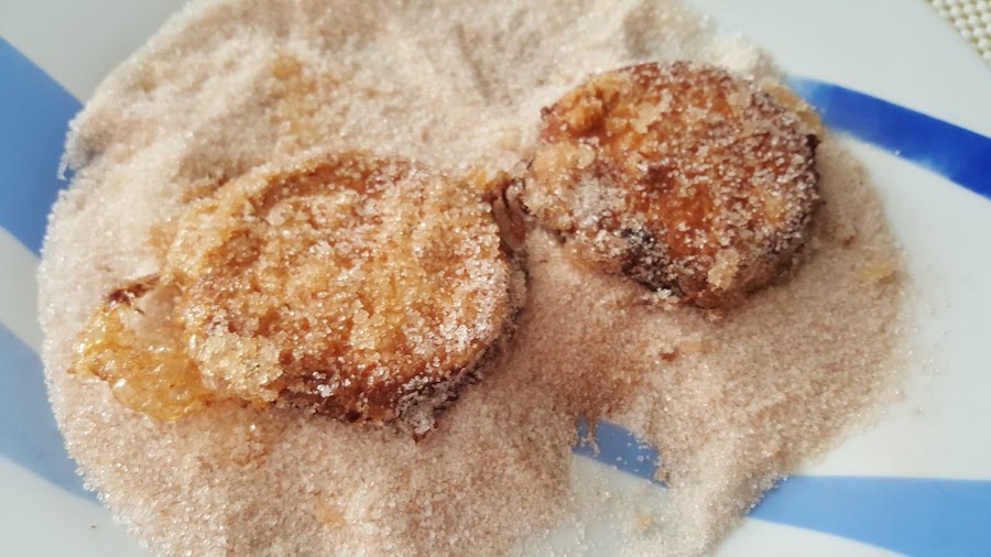 8. – Cuando empiecen a tomar color, les damos la vuelta, con cuidado, y sacamos, escurriendo un poco el aceite y las pasamos por la mezcla de azúcar y canela.