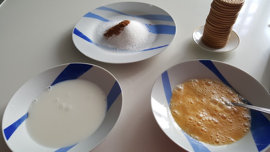 5. – Ponemos un plato o recipiente con medio vaso (100 ml) de leche fría y otro con los huevos batidos.