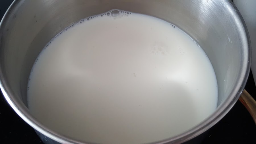 1. – Lo primero que haremos será el relleno, poniendo en una olla la leche (reservando medio vaso para diluir el preparado de flan) con 4 cucharadas de azúcar.
