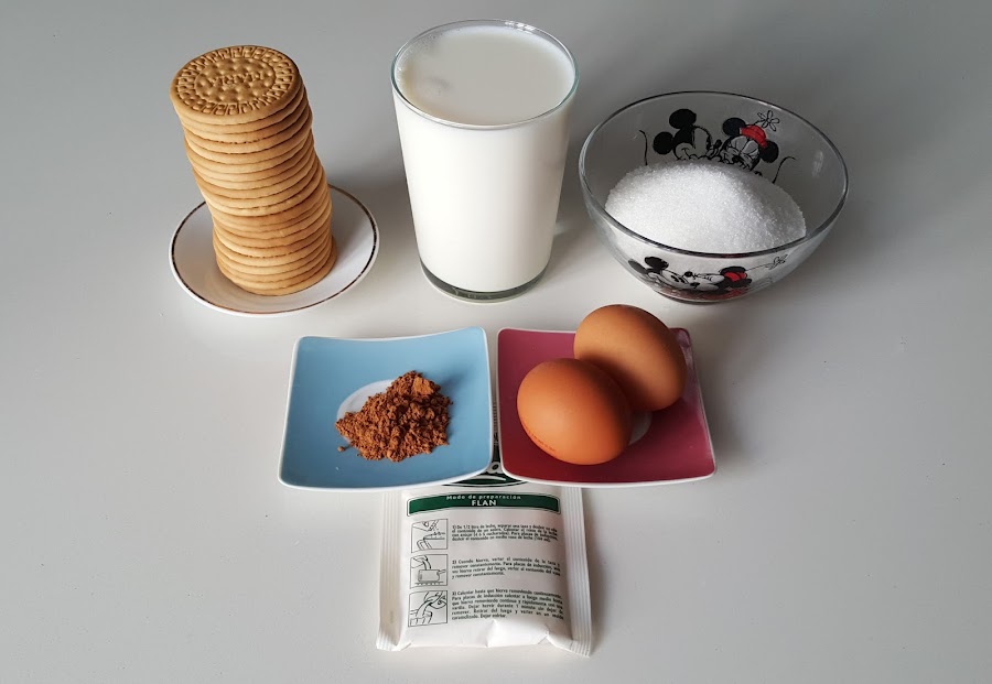 La verdad es que es sencilla de hacer, con ingredientes más o menos comunes en nuestras casa, como son leche, huevos azúcar y galletas, aunque yo he simplificado la receta utilizando preparado para flan para hacer el relleno….