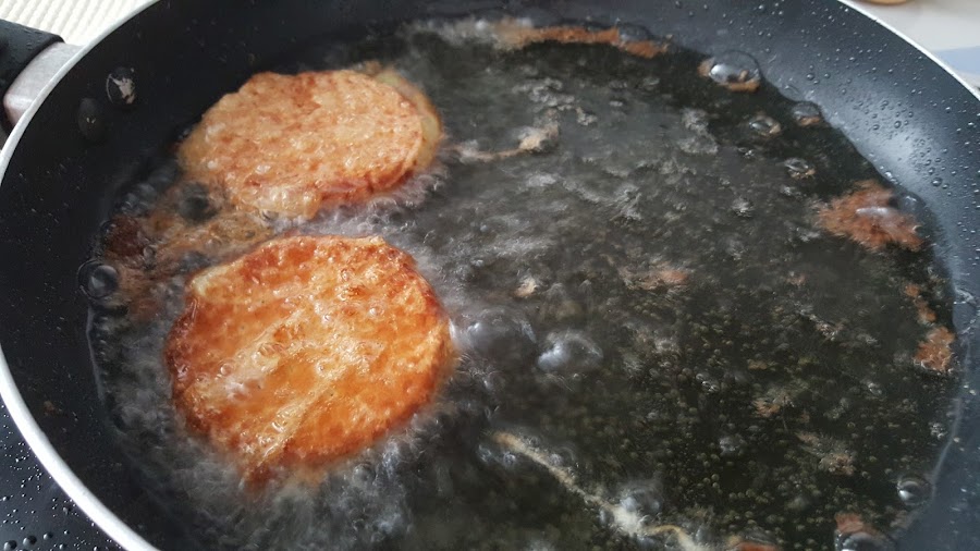 3. – Una vez está casi frío el relleno, ponemos una sartén con aceite de girasol a calentar a fuego medio, y pasamos a las galletas, las disponemos sobre papel absorbente y vamos colocando el relleno encima de cada una.