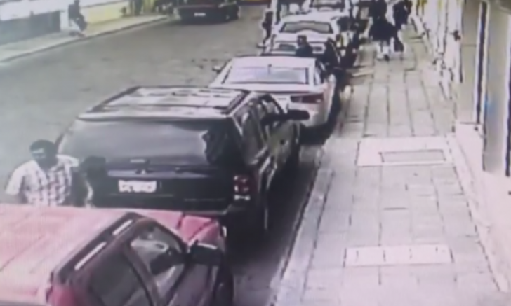 Un primer sujeto va caminando por la acera y pasa muy cerca del vehículo de la víctima –un todoterreno de color oscuro- para cerciorarse que en su interior solo se encuentra una mujer en la silla del copiloto. Luego se devuelve y permanece de pie frente a un coche estacionado más adelante