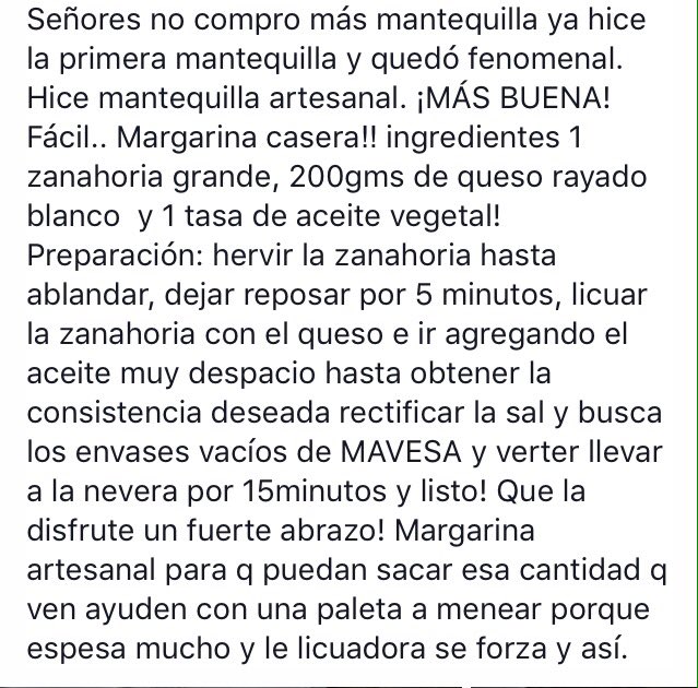 “Señores no compro más mantequilla, ya hice la primera mantequilla y quedó fenomenal. Solo necesitas zanahoria, queso blanco y aceite vegetal”, aseguró @Precios7a, mientras que el usuario Efren Montilla retwiteó la receta y comentó así la sensilla preparacion “Me han dicho sobre esa mantequilla, un pana me dijo que le quedó full bien”.