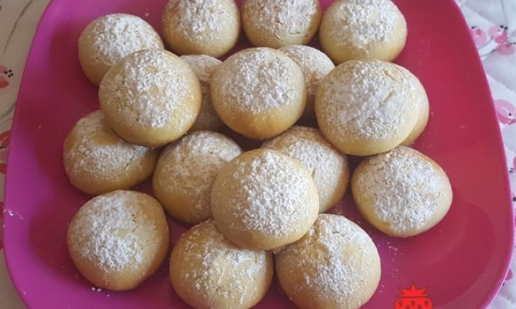 Hacemos bolitas con la masa y la vamos poniendo en una bandeja forrada de papel de horno separadas entre sí para que no se peguen al hornearse. (yo le he puesto azúcar normal por encima antes de meterlas en el horno)