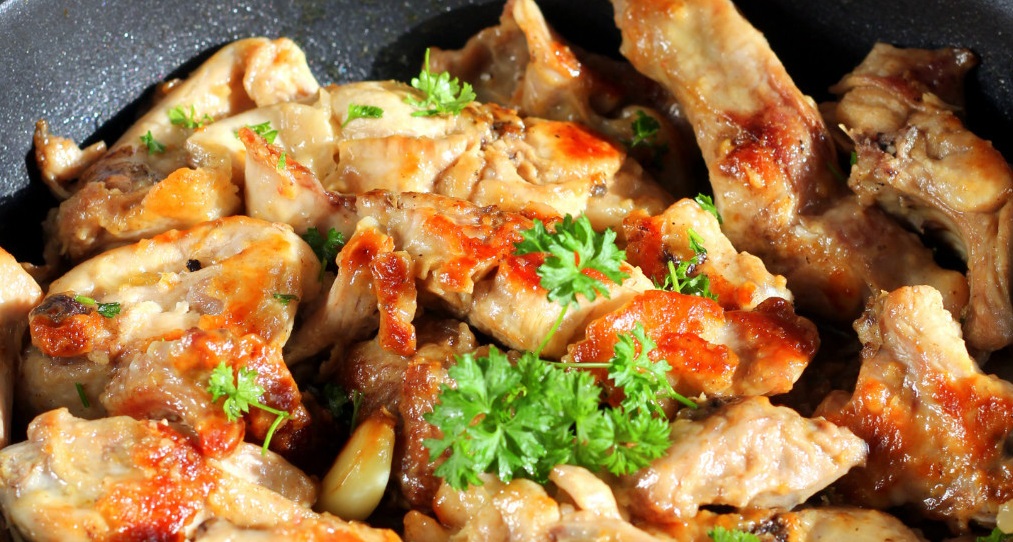 Agarrando con las dos manos las asas de la cacerola, -con cuidado para no quemarnos- agitamos la cazuela y le damos movimientos circulares. Así la salsa se va ligando mientras se evapora el resto de líquido. En dos o tres minutos, esa salsa ha impregnado las tajadas que quedan jugosas y llenas de sabor. Espolvoreamos con un poco de perejil y a la mesa para comerlo bien caliente.