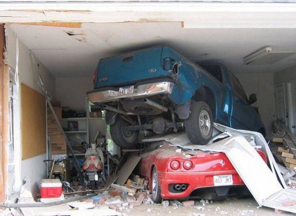 Salí a hacer unas compras y cuando regresé, hubo una pequeña confusión entre el freno y el acelerador, la puerta del garaje ha quedado un poco doblada pero por fortuna la pickup paró justo al llegar a tu nuevo coche.