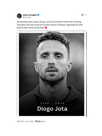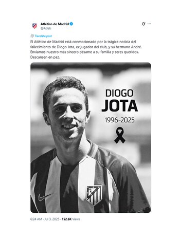 El exjugador del Liverpool Jamie Carragher también sumó su voz entre los mensajes de condolencia: “Noticias devastadoras”. Carragher dirigió especialmente su pensamiento a la familia de los hermanos fallecidos: “Mis pensamientos están especialmente con su esposa Rute y sus tres encantadores hijos”.