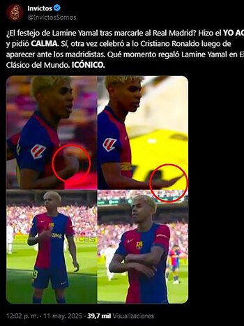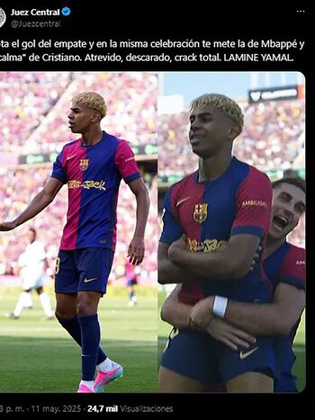 “Anota el gol del empate y, en la misma celebración, te mete la de Mbappé y el ‘calma’ de Cristiano. Atrevido, descarado, crack total, Lamine Yamal”, expresó un usuario. Otro mensaje apuntó: “Lamine Yamal recrea la celebración de Mbappé para burlarse de él”.