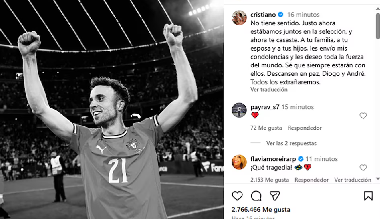 “No tiene sentido. Justo ahora estábamos juntos en la selección, y ahora te casaste. A tu familia, a tu esposa y a tus hijos, les envío mis condolencias y les deseo toda la fuerza del mundo. Sé que siempre estarán con ellos. Descansen en paz, Diogo y André. Todos los extrañaremos”, escribió CR7.
