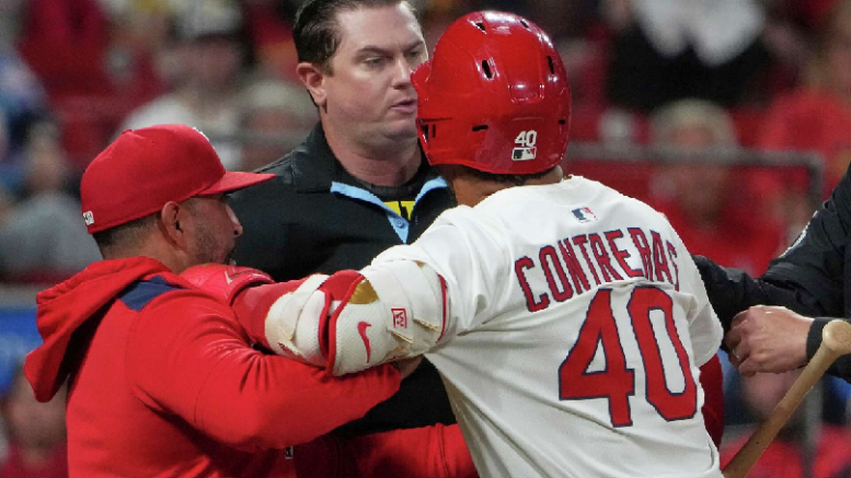El venezolano Willson Contreras, primera base de los Cardenales de San Luis, fue suspendido por seis juegos y multado con una suma no revelada tras su comportamiento en el encuentro del lunes, en el que su equipo derrotó 7-6 a los Piratas de Pittsburgh.