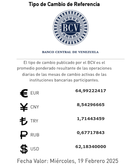 Al cierre de la jornada de este martes 18 de febrero de 2025, el dólar estadounidense se cotizó en 62,18 bolívares, informó el Banco Central de Venezuela en sus redes sociales.