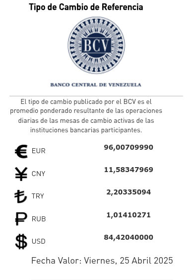 Al cierre de la jornada de este jueves 24 de abril de 2025, el dólar estadounidense se cotizó en 84,42 bolívares, informó el Banco Central de Venezuela en sus redes sociales.
