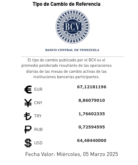 Al cierre de la jornada de este viernes 28 de febrero de 2025, el dólar estadounidense se cotizó en 64,48 bolívares, informó el Banco Central de Venezuela en sus redes sociales.