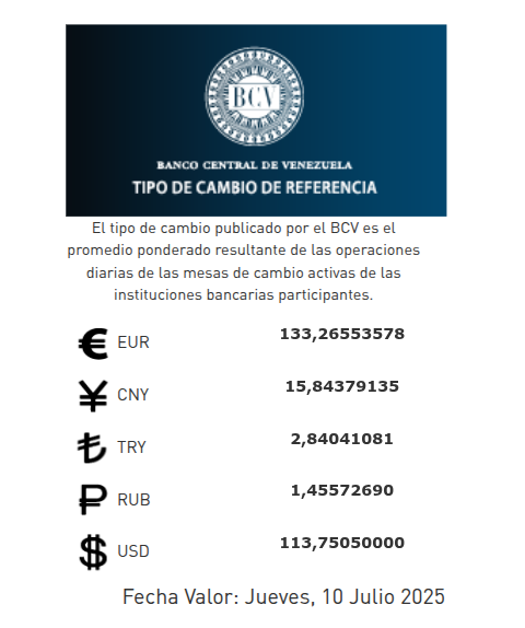 Al cierre de la jornada de este miércoles 9 de julio de 2025, el dólar estadounidense se cotizó en 113,75 bolívares, informó el Banco Central de Venezuela en sus redes sociales.