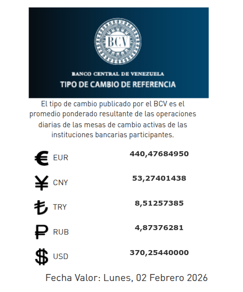 El Banco Central de Venezuela publicó en sus redes sociales al cierre de la jornada de este viernes 30 de enero de 2026, el dólar se cotizará en 370,25 bolívares con fecha valor lunes 2 de febrero de 2026.