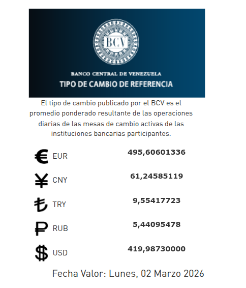 El Banco Central de Venezuela publicó en sus redes sociales al cierre de la jornada de este viernes 27 de febrero de 2026, el dólar se cotizará en 419,98 bolívares con fecha valor lunes 2 de marzo de 2026.