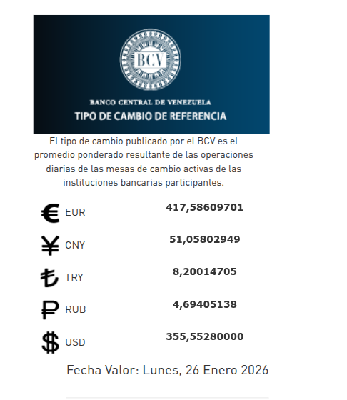 El Banco Central de Venezuela publicó en sus redes sociales al cierre de la jornada de este viernes 23 de enero de 2026, el dólar se cotizará en 355,55 bolívares con fecha valor lunes 26 de enero de 2026.