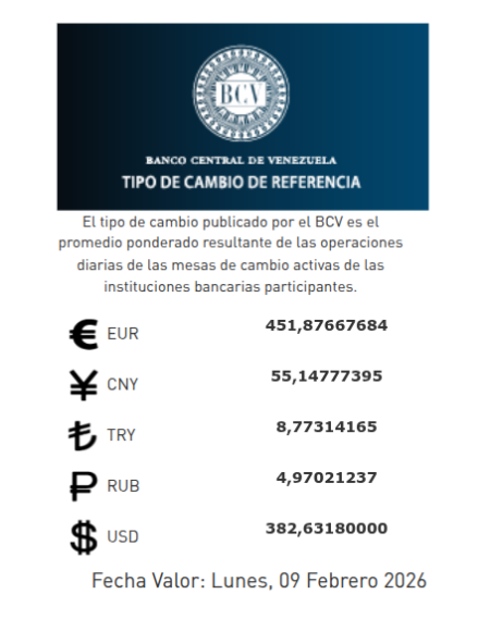 El Banco Central de Venezuela publicó en sus redes sociales al cierre de la jornada de este viernes 6 de febrero de 2026, el dólar se cotizará en 382,63 bolívares con fecha valor lunes 9 de febrero de 2026.
