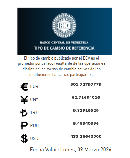 El Banco Central de Venezuela publicó en sus redes sociales al cierre de la jornada de este viernes 6 de marzo de 2026, el dólar se cotizará en 433,16 bolívares con fecha valor viernes 6 de marzo de 2026.