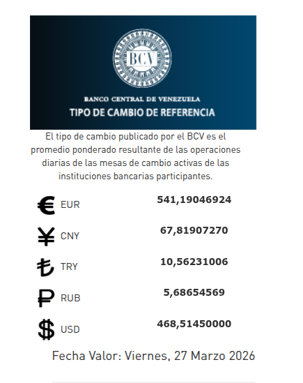 El Banco Central de Venezuela publicó en sus redes sociales al cierre de la jornada de este jueves 26 de marzo de 2026, el dólar se cotizará en 468,51 bolívares con fecha valor viernes 27 de marzo de 2026.