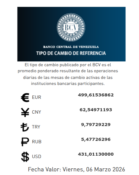El Banco Central de Venezuela publicó en sus redes sociales al cierre de la jornada de este jueves 5 de marzo de 2026, el dólar se cotizará en 431,01 bolívares con fecha valor viernes 6 de marzo de 2026.