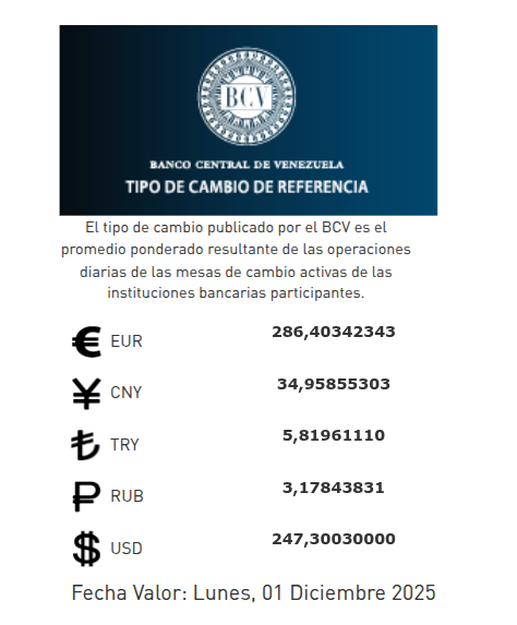 De acuerdo con la información indicada por el Banco Central de Venezuela al cierre de este viernes 28 de noviembre, el dólar se cotizará en 247,30 bolívares con fecha valor lunes 1° de diciembre de 2025.