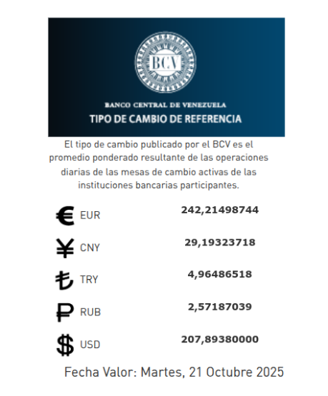 De acuerdo con la información indicada por el Banco Central de Venezuela al cierre de este lunes 20 de octubre, el dólar se cotizará en 207,89 bolívares con fecha valor martes 21 de octubre de 2025.