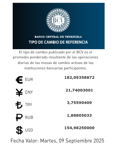 De acuerdo con la información indicada por el Banco Central de Venezuela al cierre de este lunes 8 de septiembre, el dólar se cotizará en 154,98 bolívares durante la jornada del martes 9 de septiembre de 2025, luego de aumentar 0,62% en comparación con la jornada anterior.