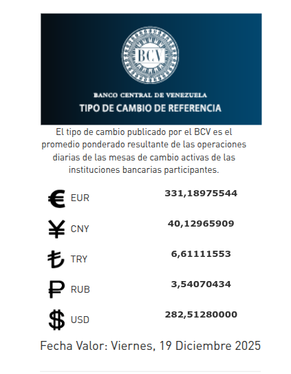 De acuerdo con la información indicada por el Banco Central de Venezuela al cierre de este jueves 18 de diciembre, el dólar se cotizará en 282,51 bolívares con fecha valor viernes 19 de diciembre de 2025.