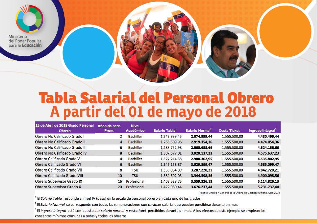 El salario base del personal docente categoría I se ubicará en 7 millones 355 mil 609 con 86 bolívares (7.355.605,86); el ingreso integral, el cual incluye el cestaticket socialista, quedó contemplado en 8 millones 911 mil 109 con 86 bolívares (8.911.109,86). Mientras que el docente categoría VI cobrará como salario base 16 millones treinta y un mil 801 con 19 bolívares (16.031.801,19), y su ingreso integral será de 17 millones 587 mil 301 con 19 bolívares (17.587.301, 19).