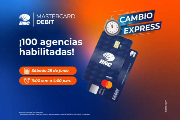 Con el propósito de mejorar la experiencia de sus clientes, BNC llevará a cabo el próximo sábado 28 de junio una nueva jornada especial de “Cambio Express” en todo el territorio nacional, para hacer entrega de las tarjetas BNC MastercardDebit.
