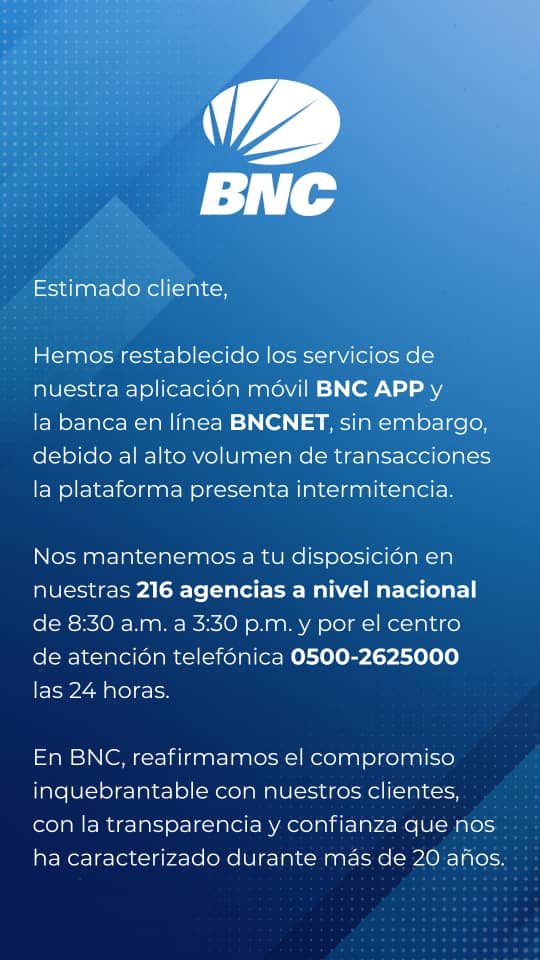 El Banco Nacional de Crédito (BNC) informó a sus clientes, a través de un comunicado oficial este 2 de julio, sobre el restablecimiento de los servicios de su aplicación móvil BNC APP y el servicio de su banca en línea BNCNET.