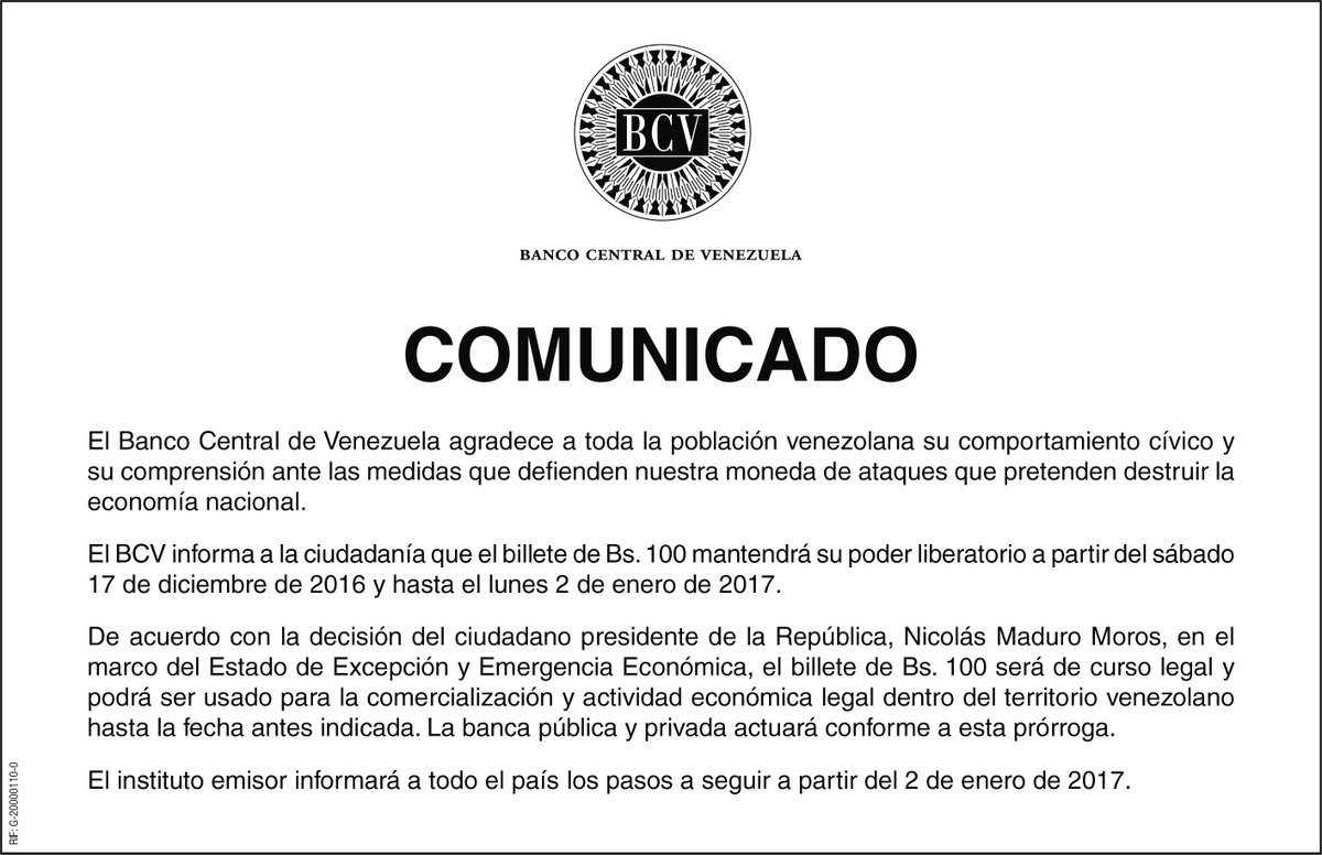 A través de un comunicado, el Banco Central de Venezuela (BCV) informó que el billete de 100 bolívares «será de curso legal y podrá ser utilizado para la comercialización y la actividad económica legal dentro del territorio venezolano», hasta el próximo lunes 2 de enero de 2017, tal y como lo decidió recientemente el presidente de la República Nicolás Maduro en el contexto del Estado de Excepción y Emergencia Económica.
